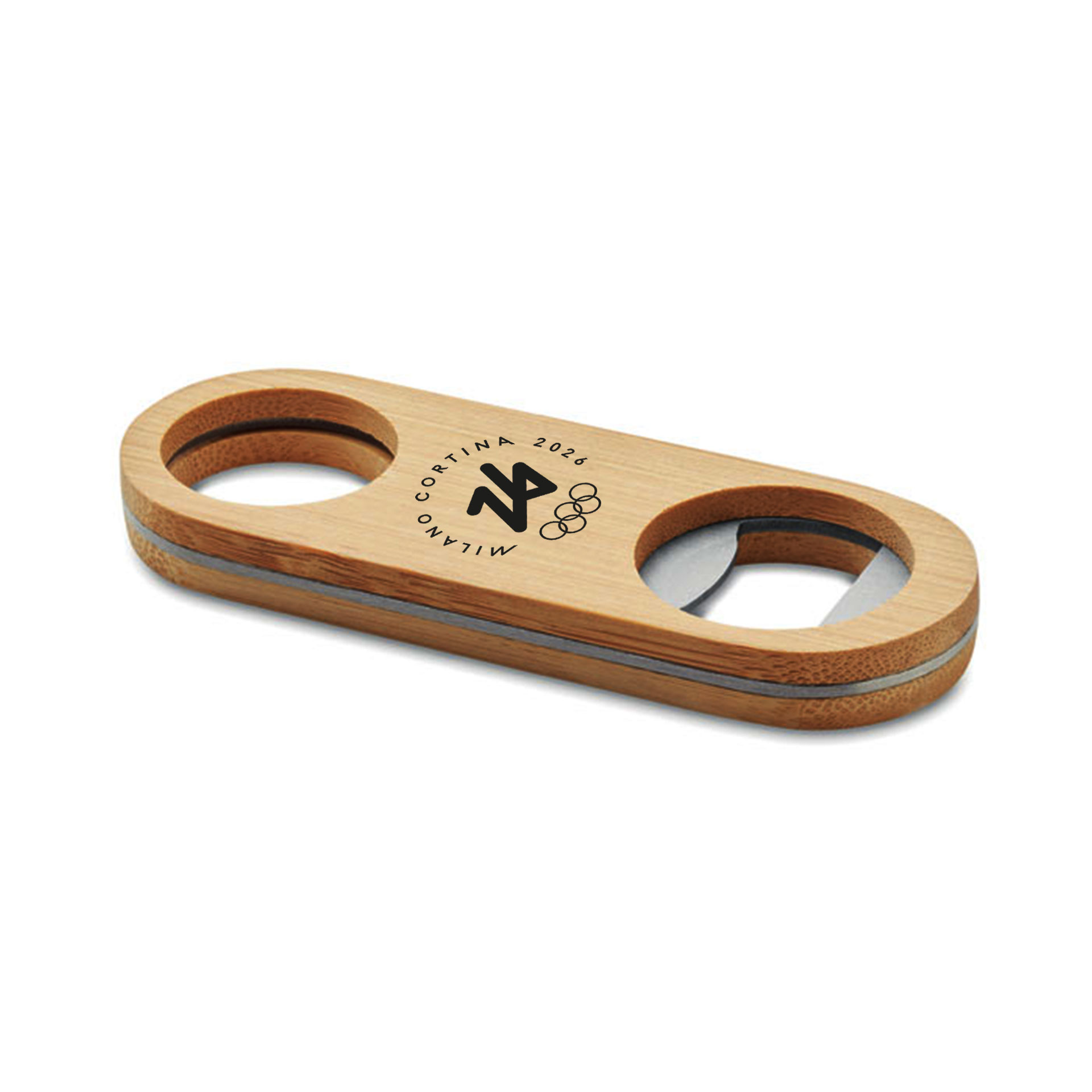 APRIBOTTIGLIE OLIMPIADI MILANO CORTINA 2026 IN ACCIAIO INOSSIDABILE CON SUPERFICIE IN BAMB? DIMENSIONE 10,5X4X1 CM LOGO OLYMPIC EMBLEMA MONOCROMATICO NERO 5 CERCHI SU FONDO BAMB?