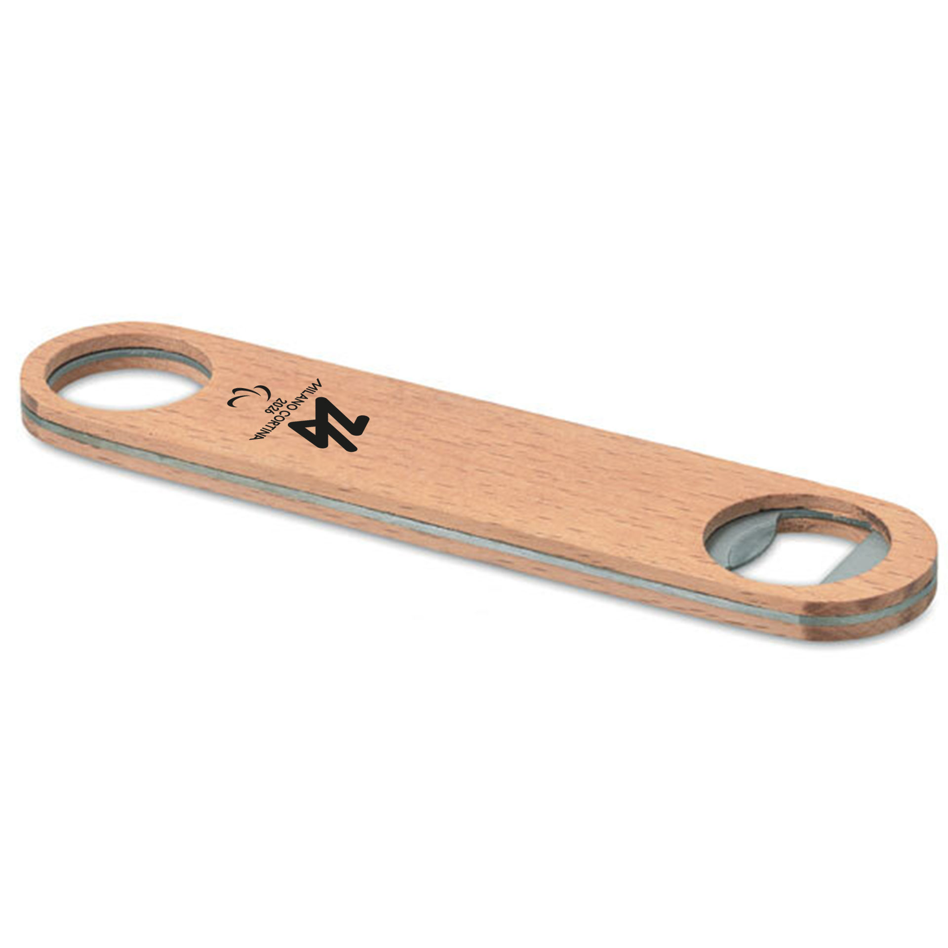 APRIBOTTIGLIE OLIMPIADI MILANO CORTINA 2026 IN ACCIAIO INOSSIDABILE CON SUPERFICIE IN LEGNO DIMENSIONE 17,5X3,5X0,8 CM LOGO PARALYMPIC EMBLEMA MONOCROMATICO NERO SU FONDO LEGNO