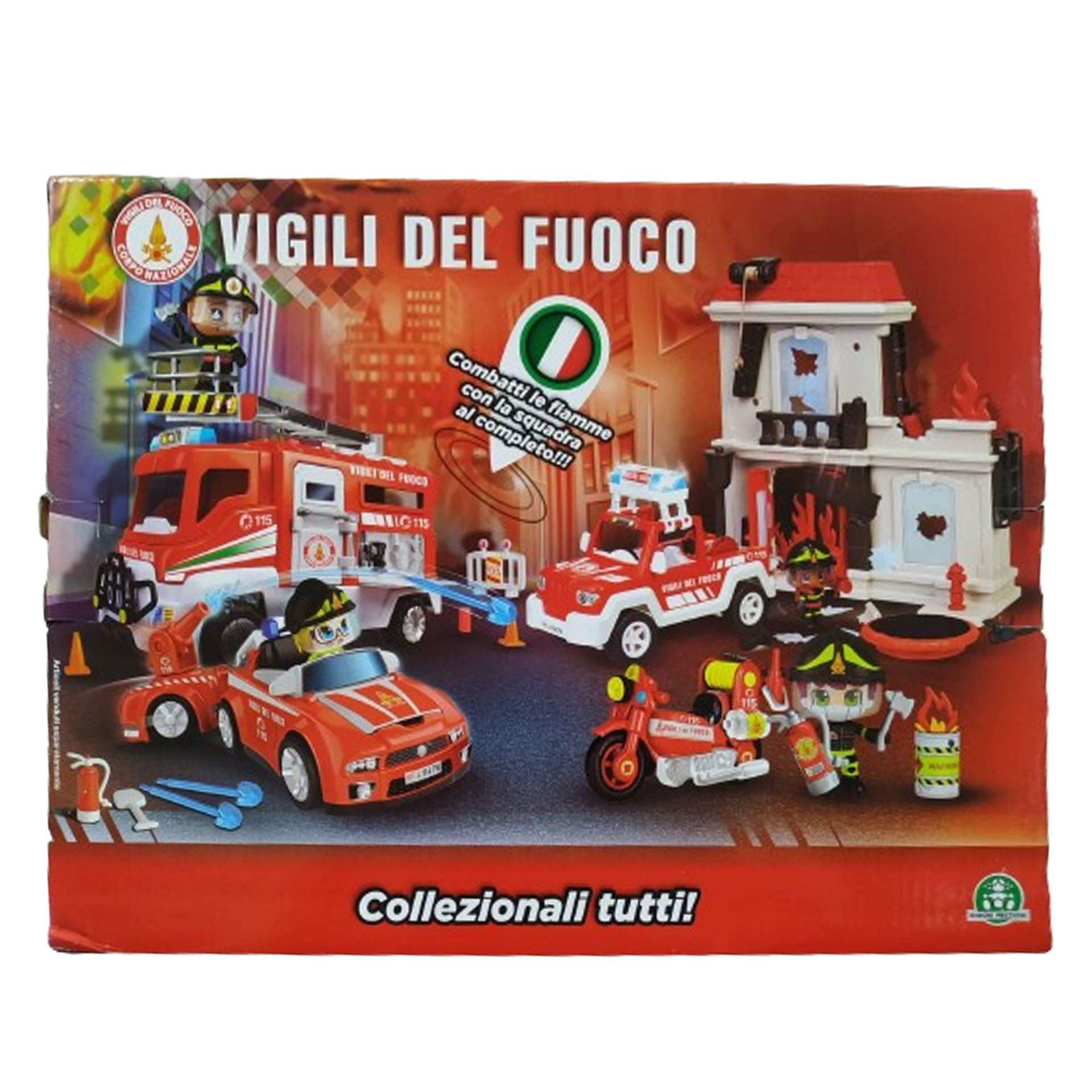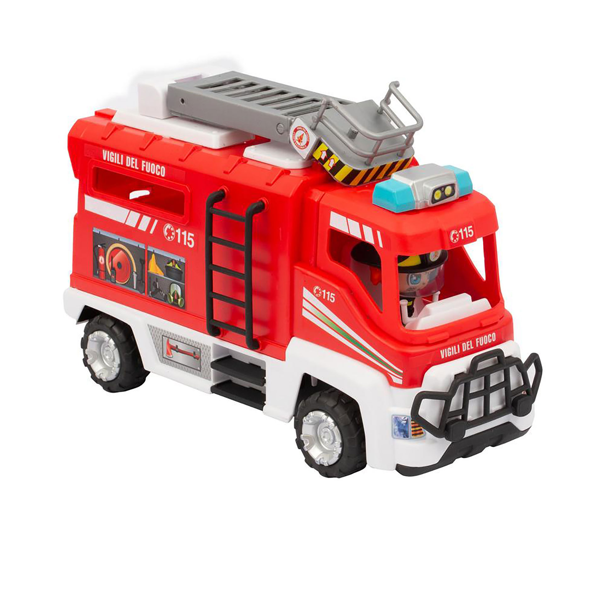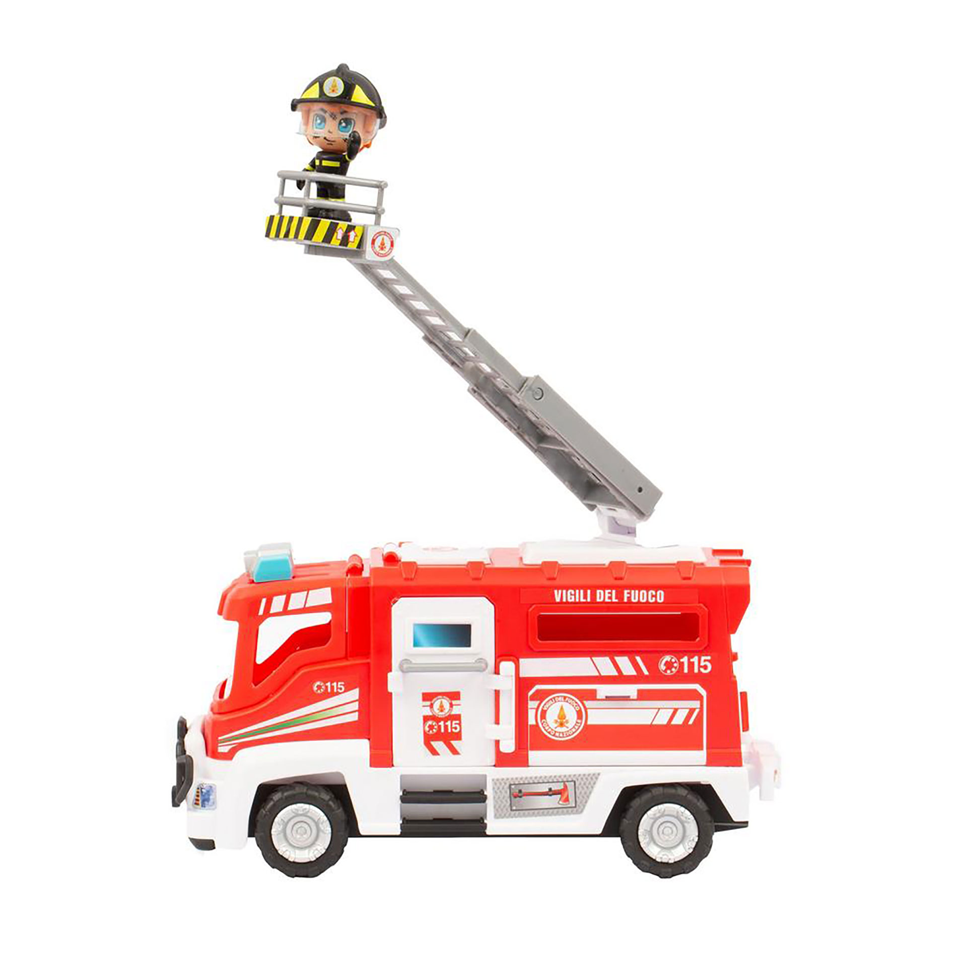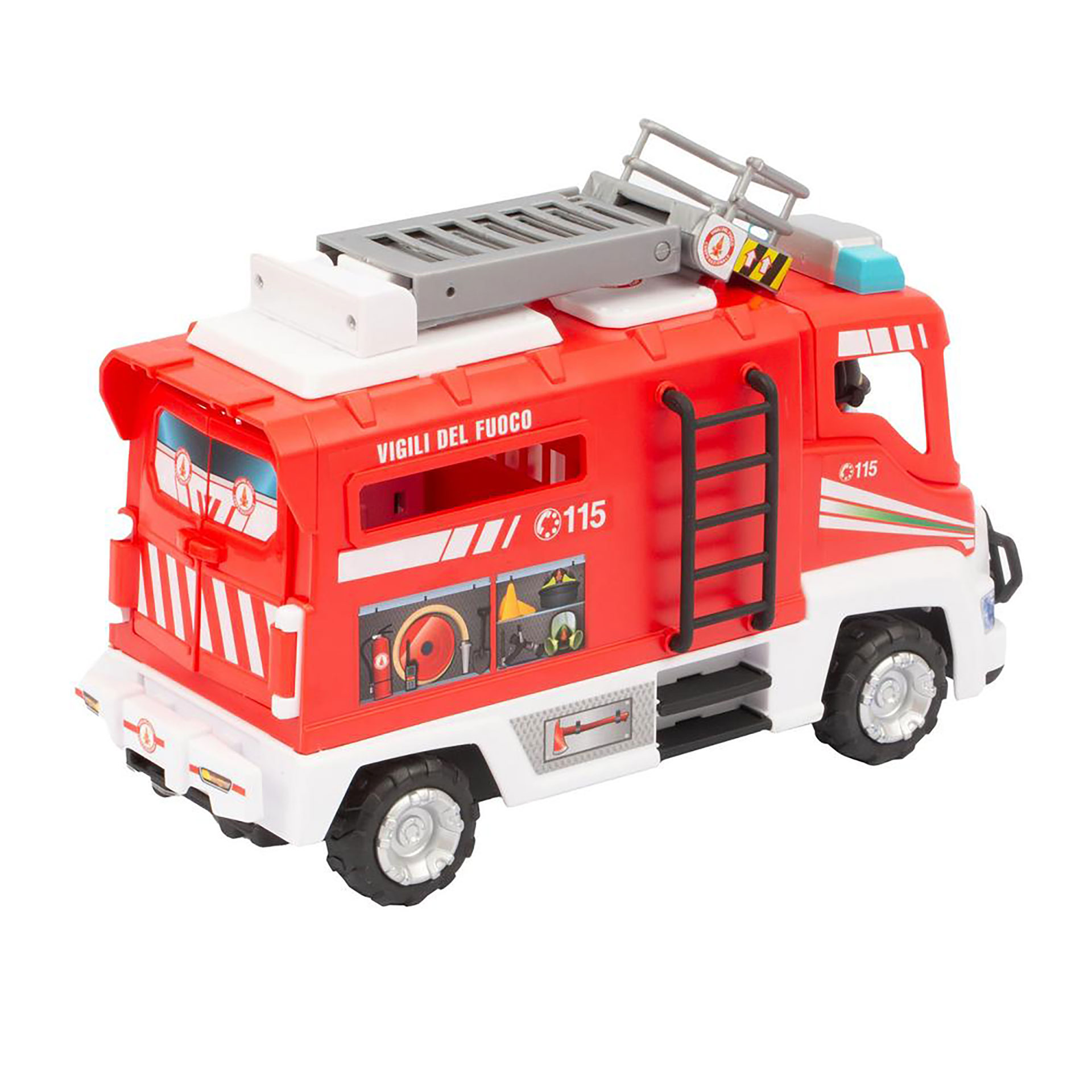 AUTOBOTTE CON LIVREA ORIGINALE A RUOTA LIBERA VIGILI DEL FUOCO, CON SCALA ESTENSIBILE, CON SPORTELLI APRIBILI E SPAZI PER POSIZIONARE GLI ACCESSORI, INCLUSO PERSONAGGIO ARTICOLATO CON EQUIPAGGIAMENTO PER EMERGENZE