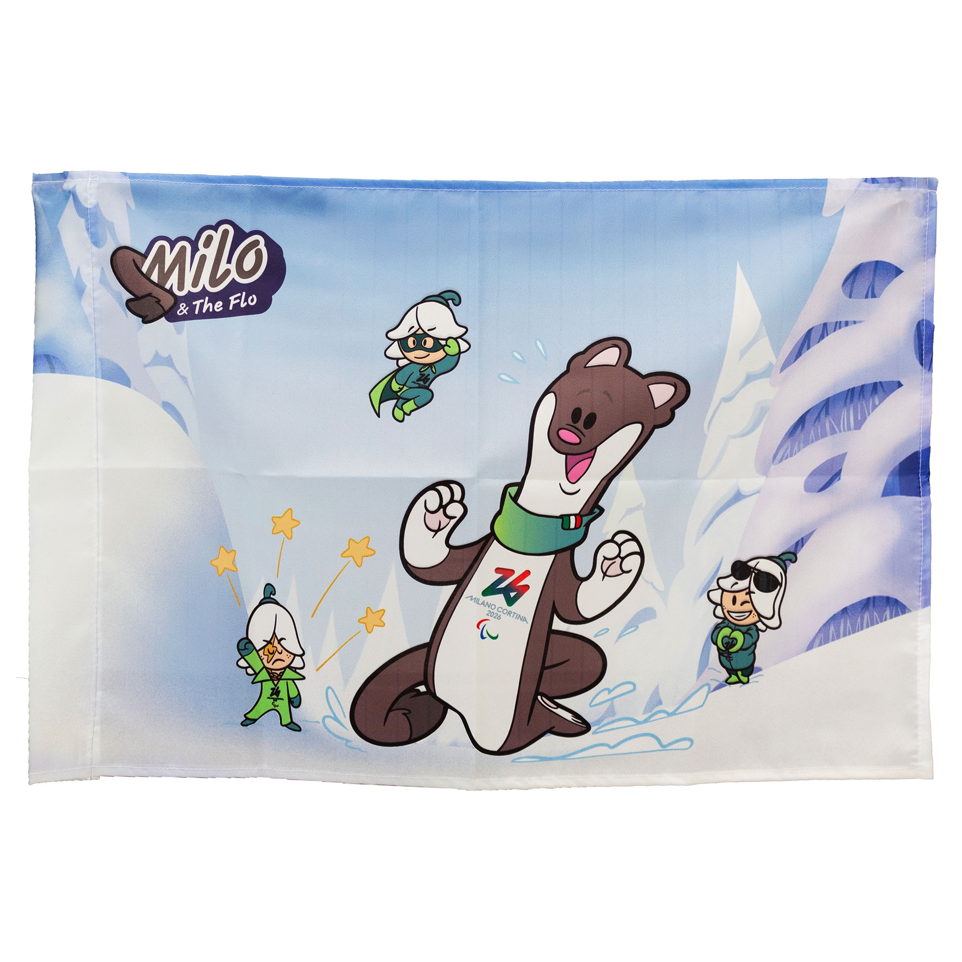 BANDIERA OLIMPIADI MILANO CORTINA 2026 IN POLIESTERE 150X100CM SENZA ASTA MASCOT MILO E THE FLOW FONDO MONTAGNA