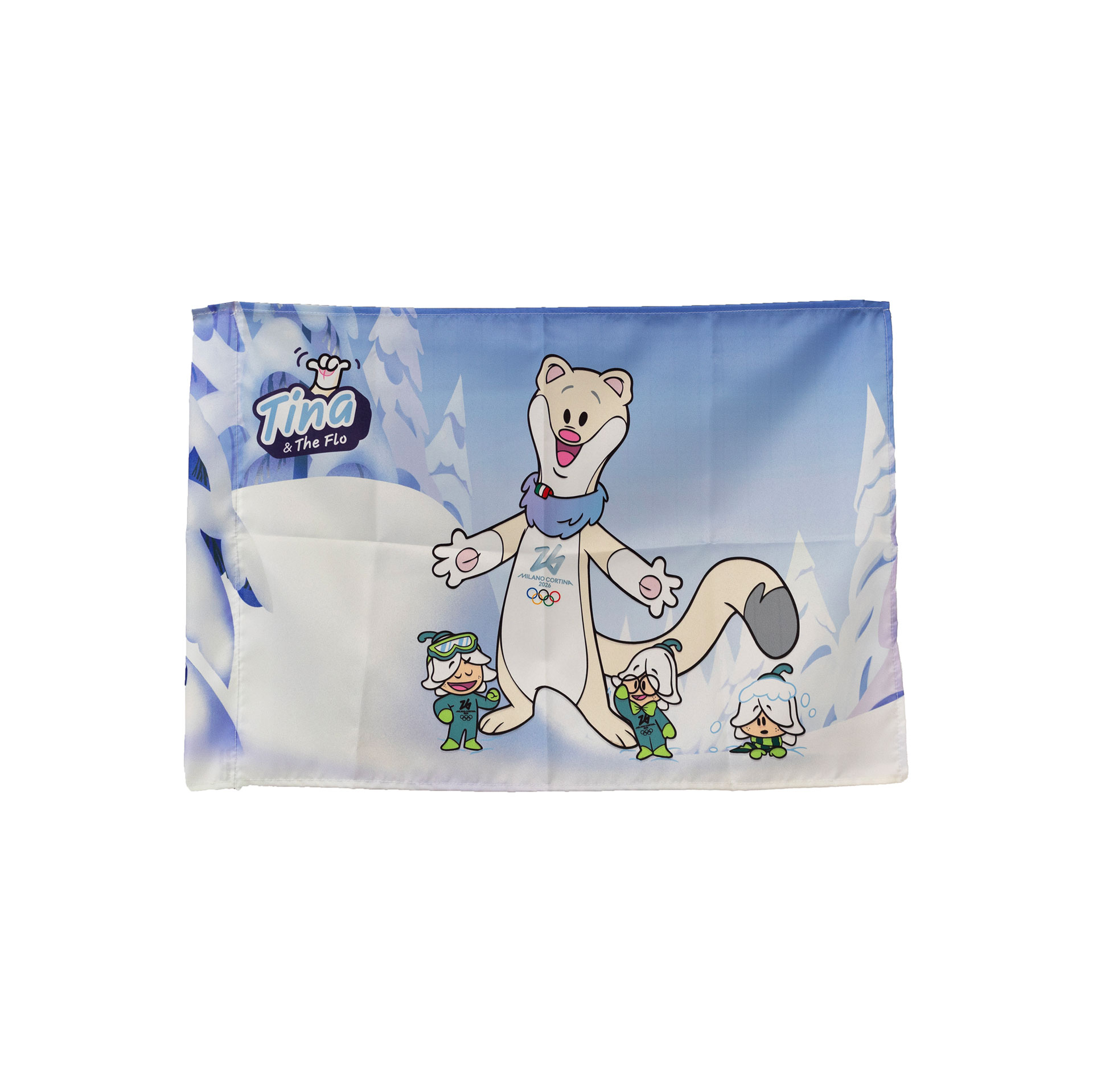 BANDIERA OLIMPIADI MILANO CORTINA 2026 IN POLIESTERE 70X50CM SENZA ASTA MASCOT TINA E THE FLOW FONDO MONTAGNA