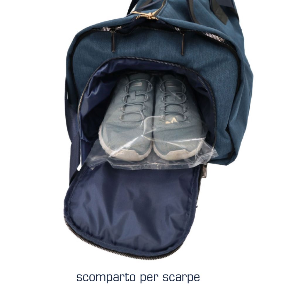 BORSA DA VIAGGIO IN MATERIALE RPET DOTATA DI SCOMPARTO PER ABITI, UNIFORMI E VESTITI ASSEMBLATA E' UNA GRANDE BORSA