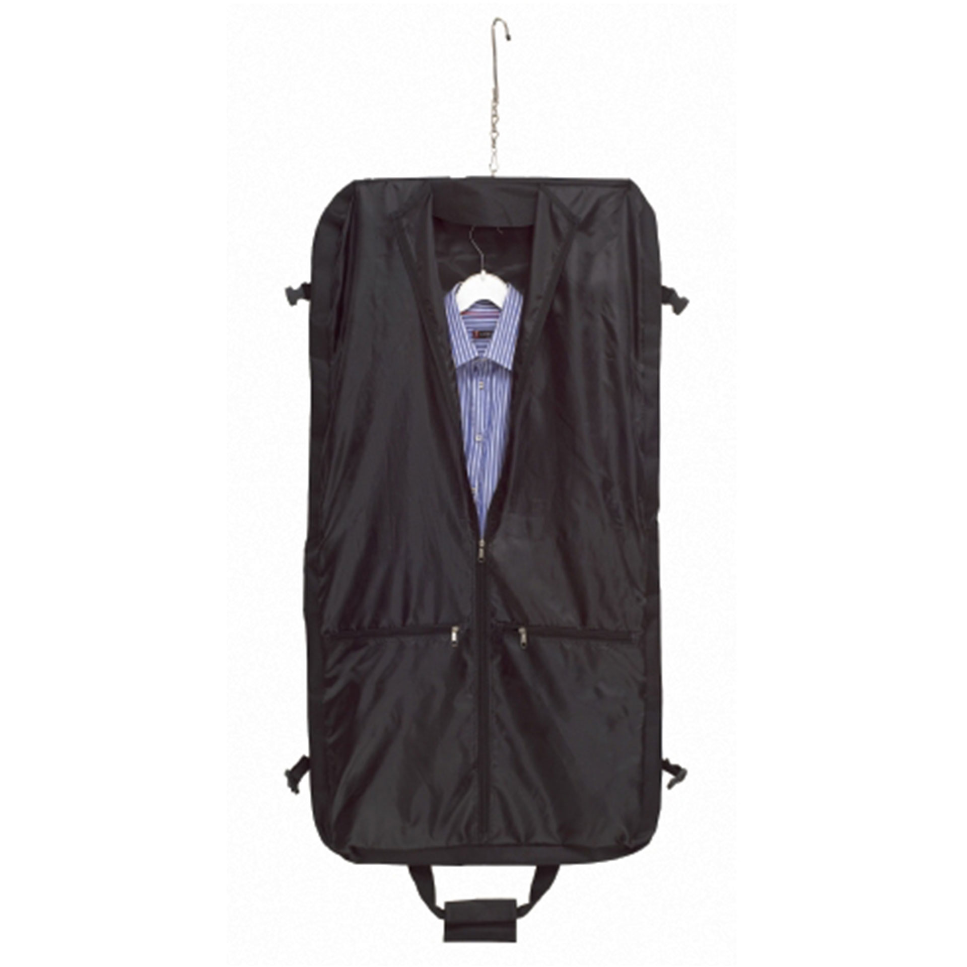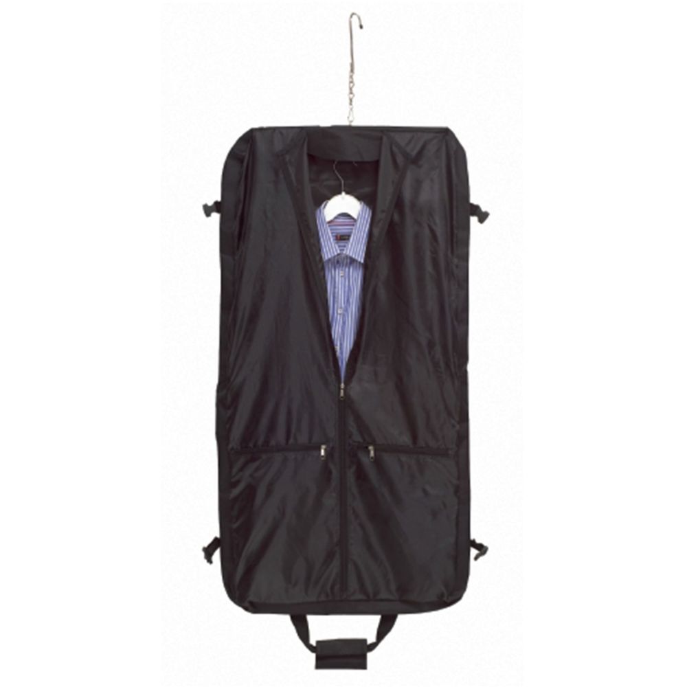 PORTA-ABITI SOLO NERO , CON APPENDINO IN METALLO, EXTRA SCOMPARTO RICHIUSO A STRAPPO, 2 MANICI CON RINFORZO A STRAPPO, 2 GANCI LATERALI DI FISSAGGIO, 2 TASCHE FRONTALI A CERNIERA, INTERNAMENTE UNO SCOMPARTO PIU? GRANDE E DUE PICCOLI A CERNIERA TRACO