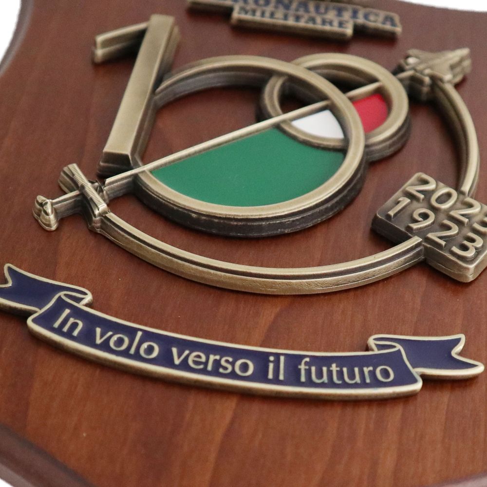 CREST LOGO 3D AM CENTENARIO SAGOMATO IN METALLO DORATO O BRONZATO E SMALTATO SU BASE IN LEGNO 22,5 X 17,5 CM
