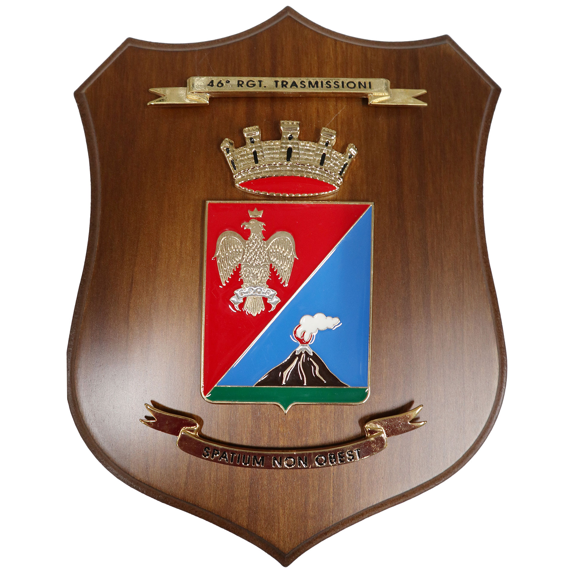 CREST IN METALLO SMALTATO BASE LEGNO 22,5X17,5CM 46 REGGIMENTO TRASMISSIONI