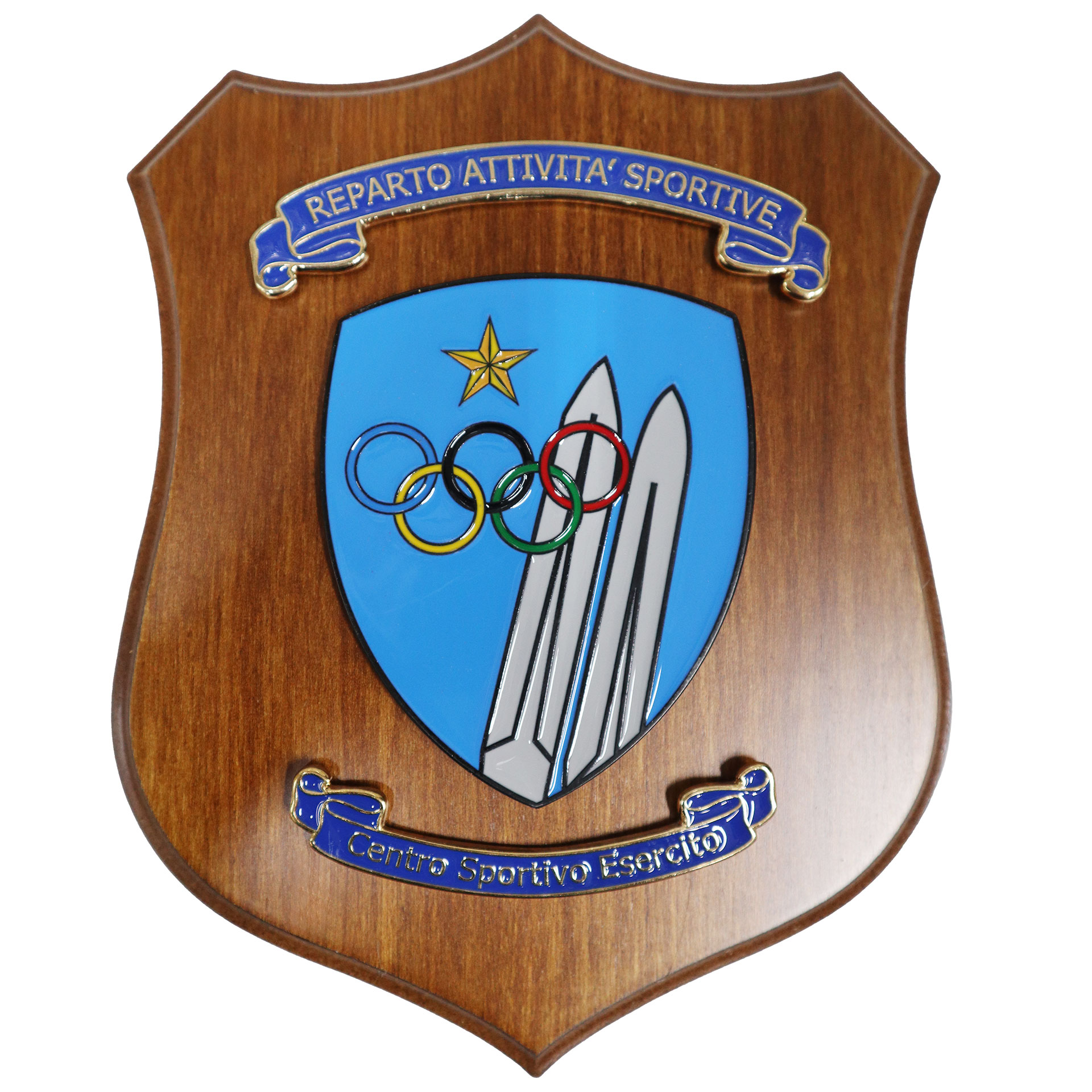CREST IN METALLO SMALTATO BASE LEGNO 22,5X17,5CM REPARTO ATTIVITA' SPORTIVE
