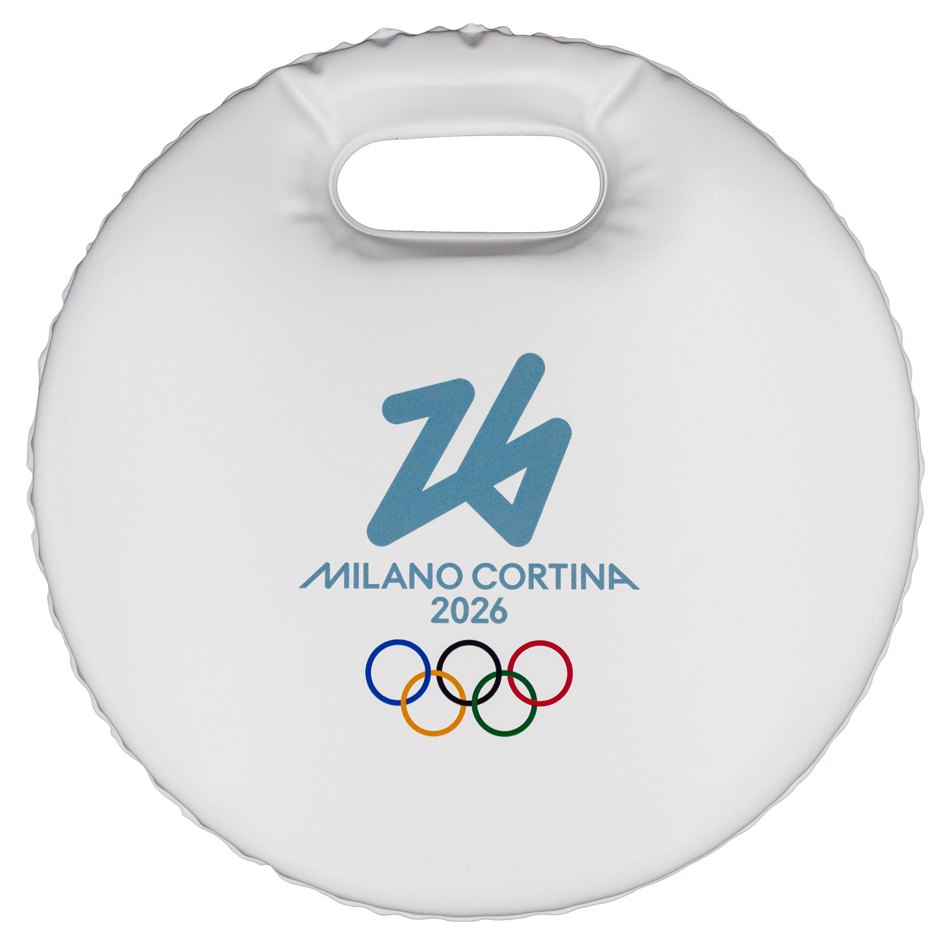 CUSCINO DA NEVE OLIMPIADI MILANO CORTINA 2026 IMBOTTITO E IMPERMEABILE BIANCO DIAMETRO 29 CM LOGO OLYMPIC EMBLEMA 5 CERCHI COLORATO