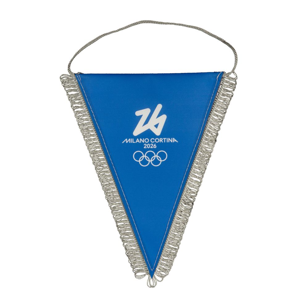 GAGLIARDETTO OLIMPIADI MILANO CORTINA 2026 TRIANGOLARE MIS. 14X17 CM FRANGIA ARGENTO BIFACCIALE FONDO BLU RETRO FONDO AZZURRO LOGHI OLYMPIC EMBLEMA 5 CERCHI E SIGN MONOCROMATICI BIANCHI