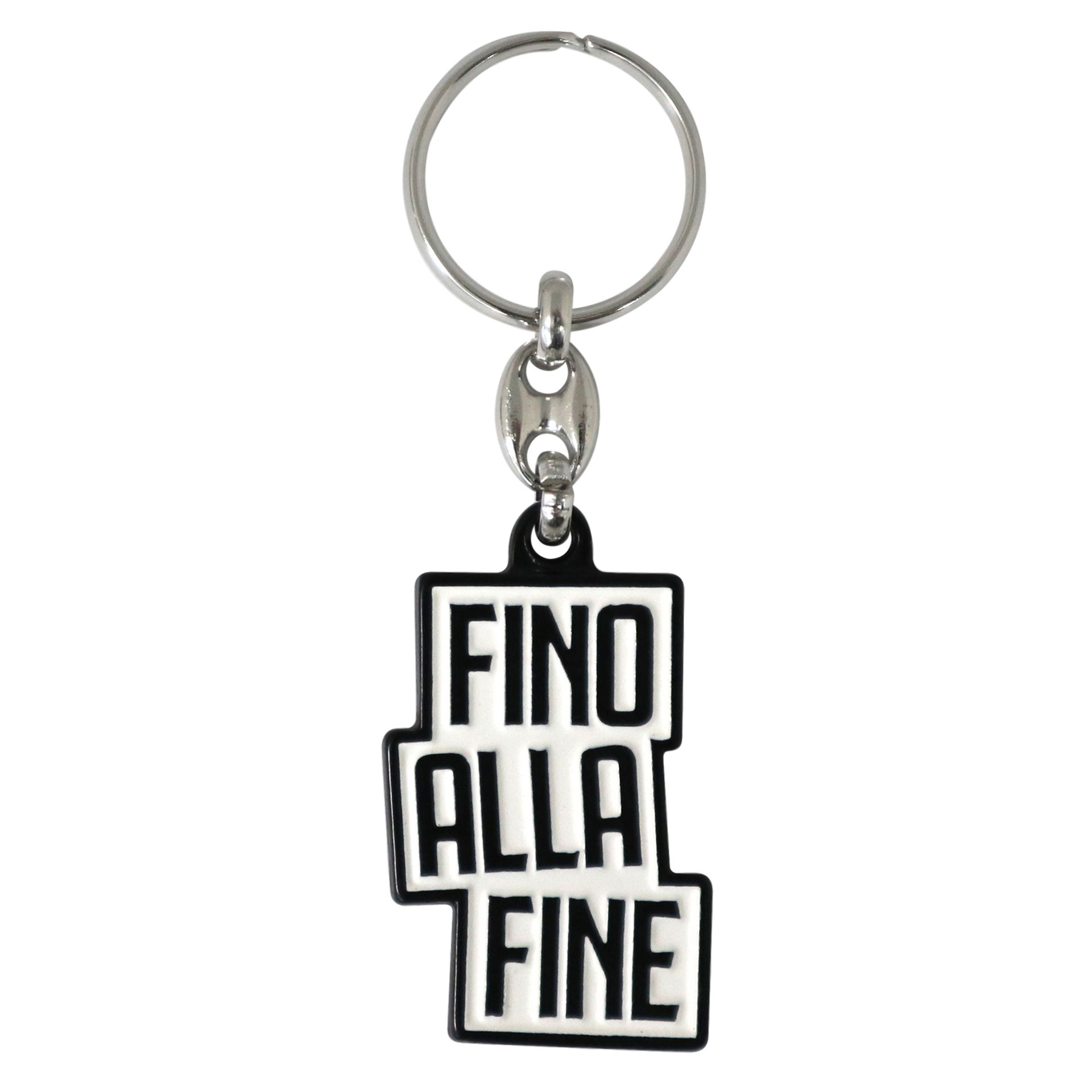 "Portachiavi rettangolare in metallo trattato nero con logo ufficiale Juventus FC, scritta ""FINO ALLA FINE"" e fondo bianco smaltato a mano.