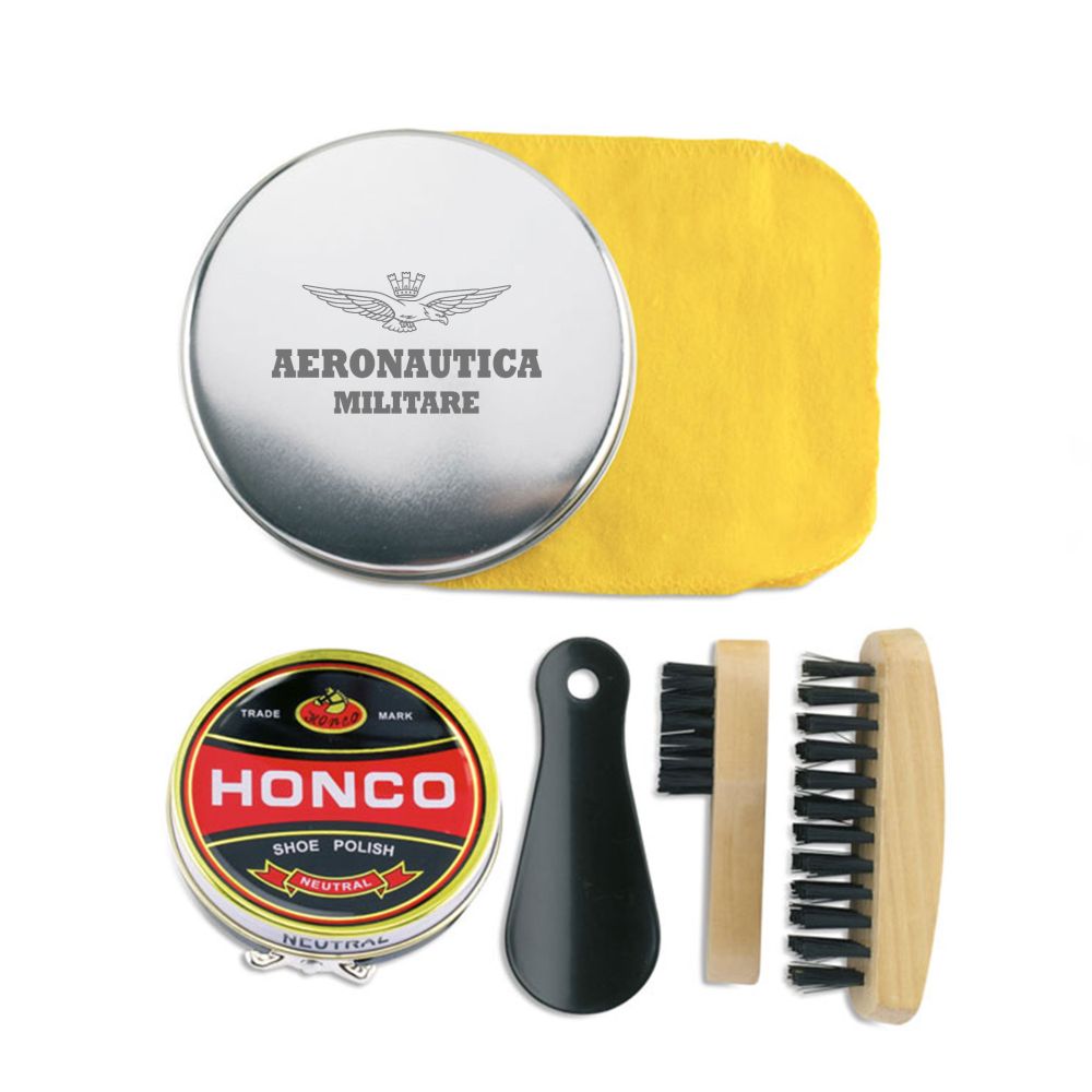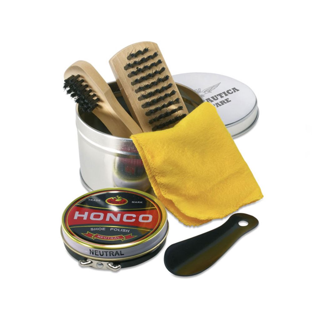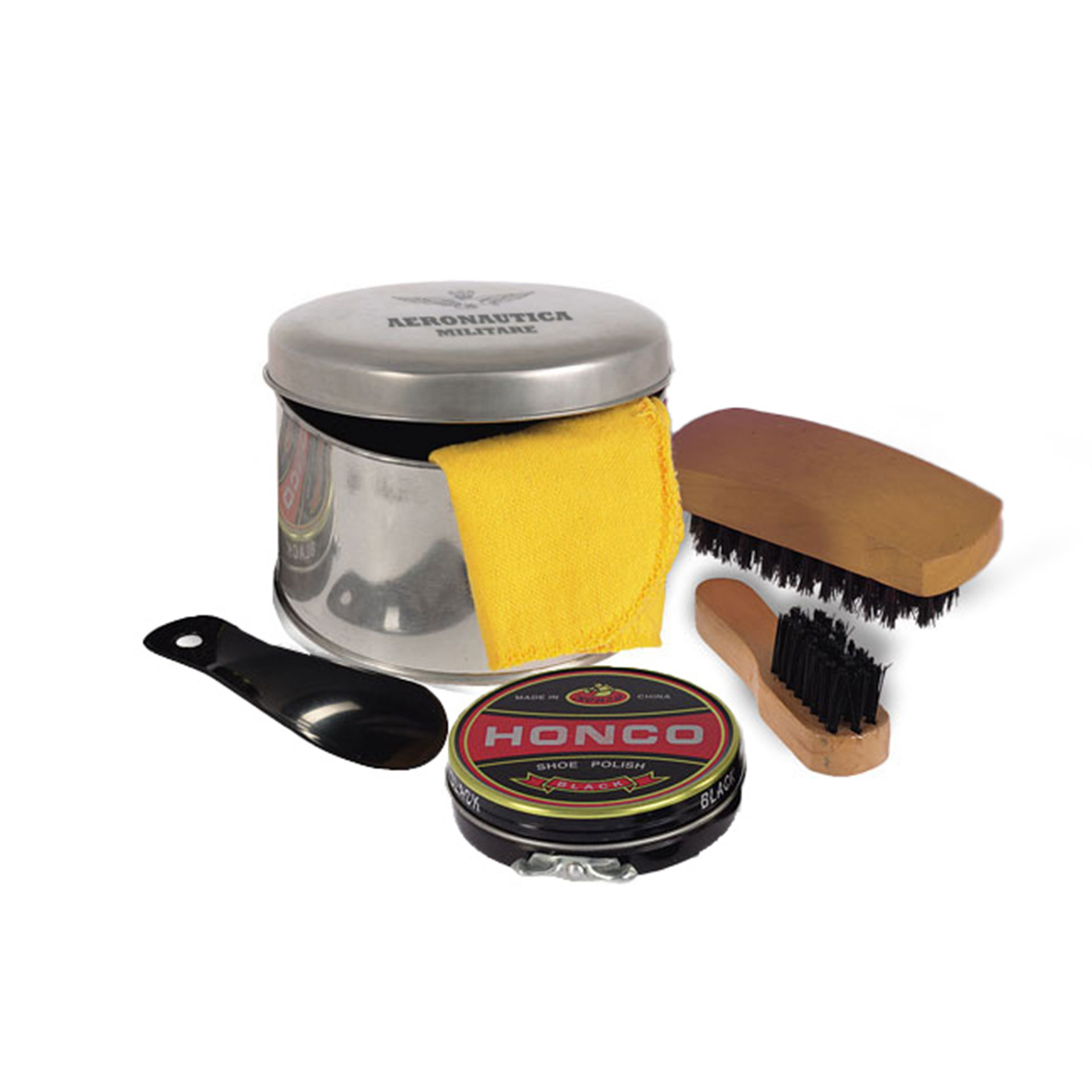 KIT LUCIDA SCARPE IN SCATOLA REGALO DI LATTA CON ALL'INTERNO 5 PEZZI UN PANNO PER LUCIDARE GIALLO, UN CALZA SCARPE, UNA SPAZZOLA GRANDE, UNA SPAZZOLA PICCOLA PER I DETTAGLI PIU' PICCOLI E UN LUCIDO PER SCARPE DI COLORE NEUTRO DIMENSIONE 9,5 ALTEZZA 5,5 Cm