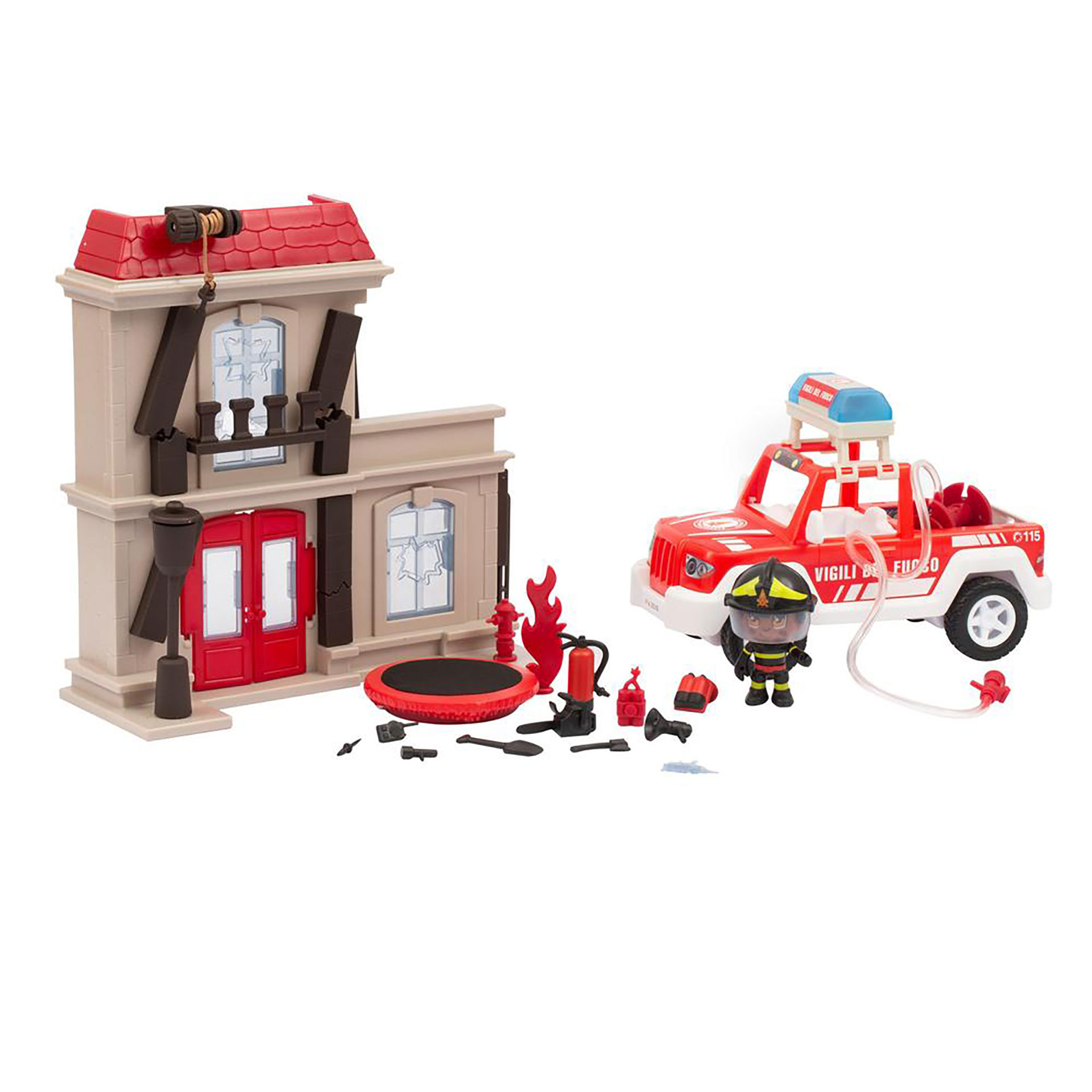 PALAZZO IN FIAMME CON TANTI DETTAGLI PER CREARE L'EMERGENZA, VEICOLO A RUOTA LIBERA CON VANO PER ACCESSORI VIGILI DEL FUOCO, INCLUSO PERSONAGGIO ARTICOLATO CON TANTI ACCESSORI PER RICREARE LA SITUAZIONE DI EMERGENZA E SOCCORSO