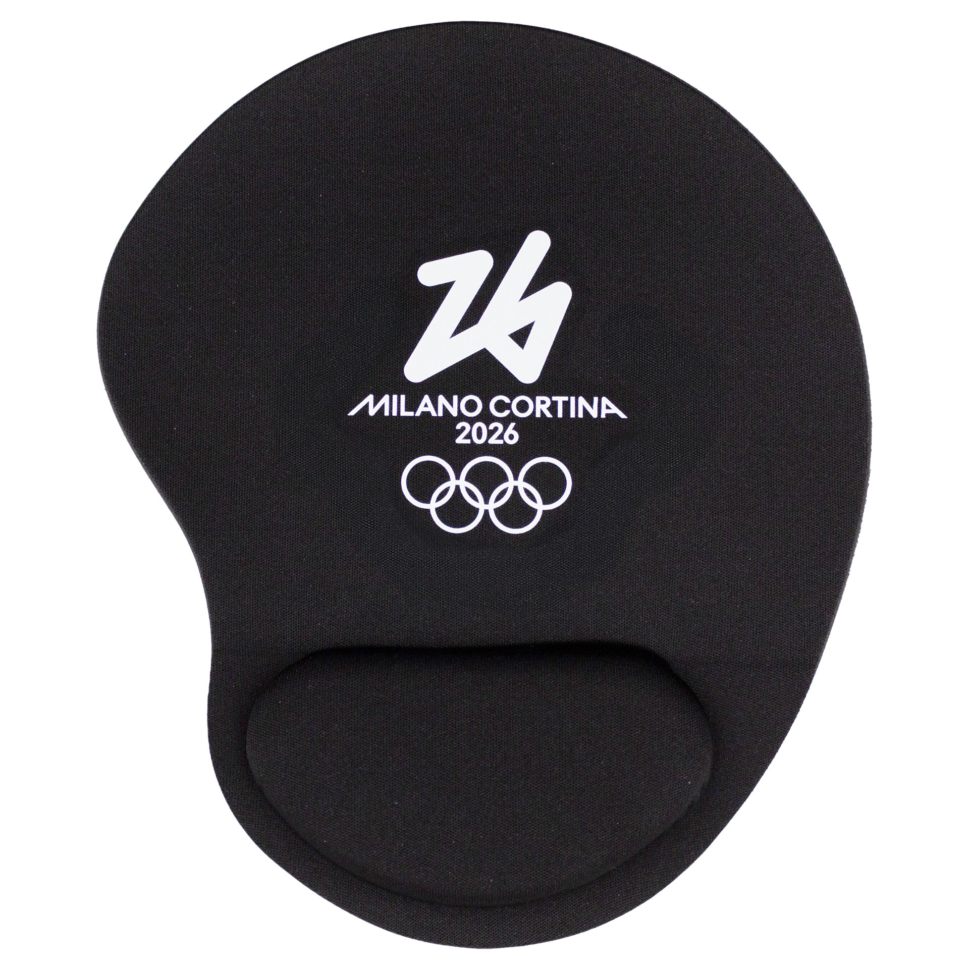 MOUSEPAD OLIMPIADI MILANO CORTINA 2026 ERGONOMICO DIM. 24X19,5 CON SUPPORTO PER IL POLSO FONDO NERO OLYMPIC EMBLEMA 5 CERCHI MONOCROMATICO BIANCO