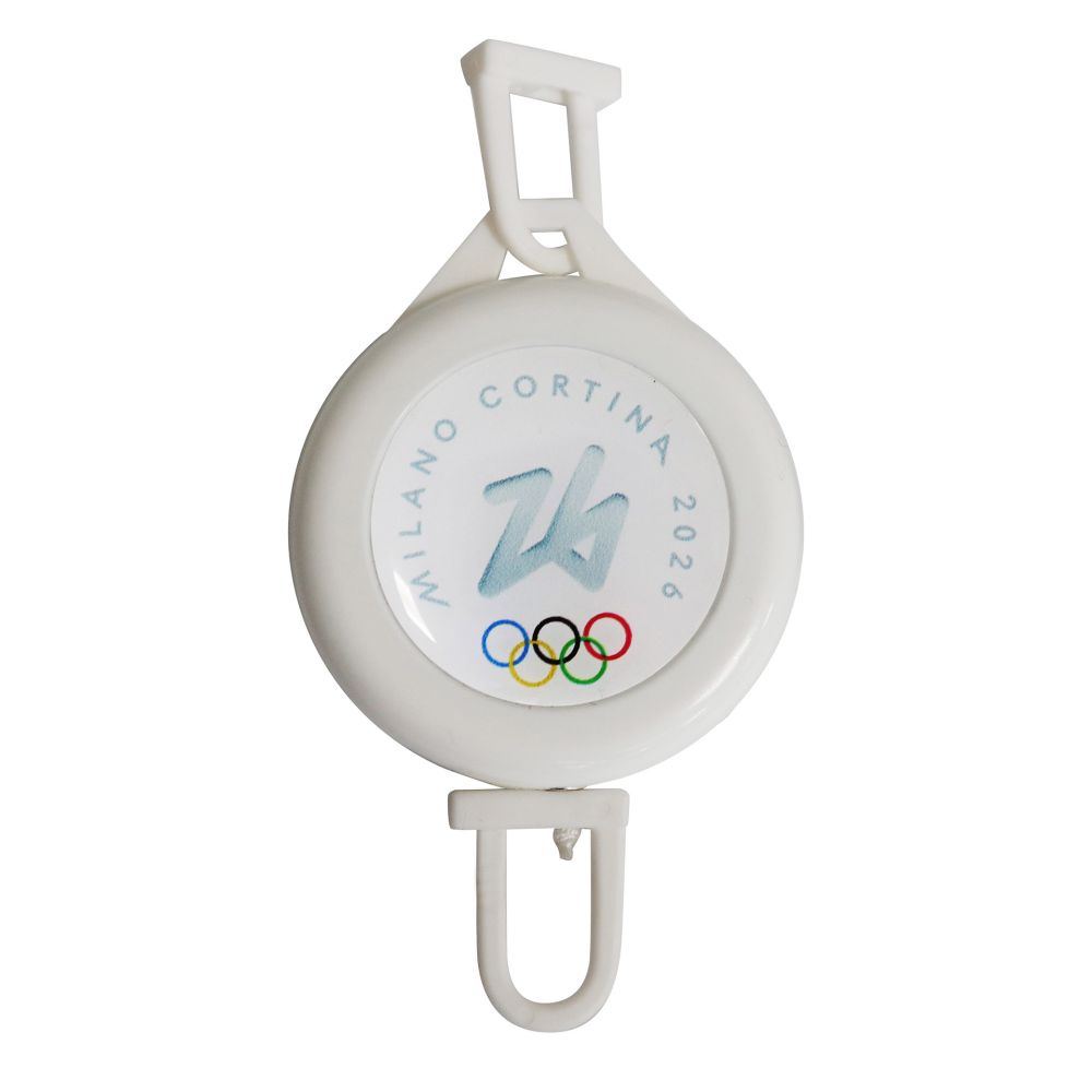 PORTA SKIPASS OLIMPIADI MILANO CORTINA 2026 IN ABS BIANCO CON CLIP DIAMENTRO 4,6 CM LOGO OLYMPIC MASCOT TINA 5 CERCHI SU FONDO BLU