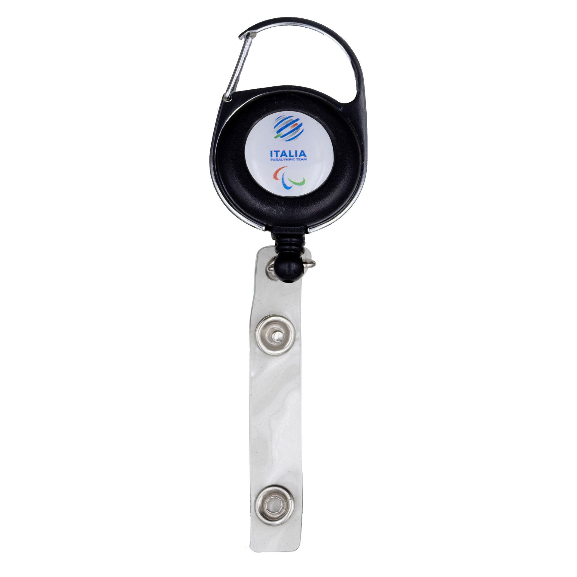 PORTA SKIPASS/PORTABADGE ITALIATEAM IN METALLO NERO TELESCOPICO CON MOSCHETTONE DIAMETRO 35X50X10 MM, LOGHI PARALYMPIC EMBLEMA E ITALIA PARALYMPIC TEAM COLORATI SU FONDO BIANCO