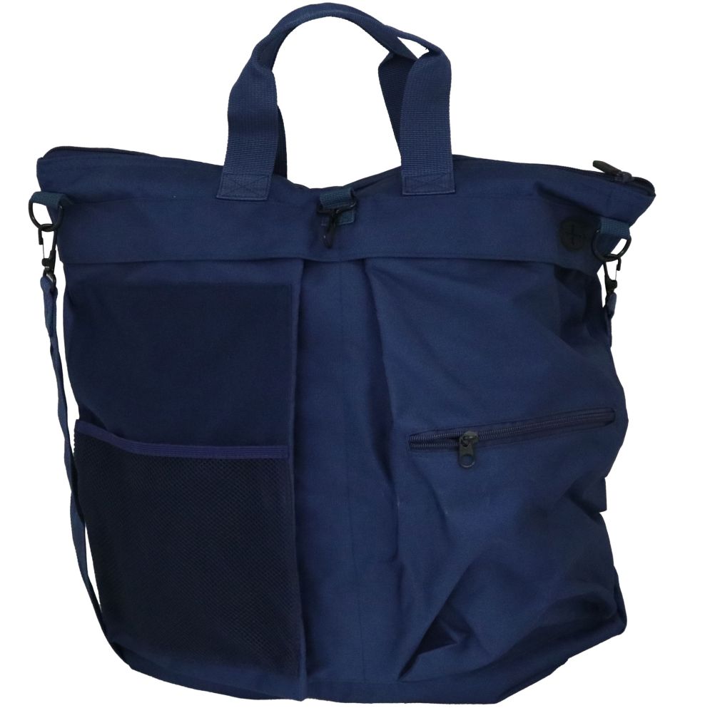 Borsa portacasco BLU con tracolla in 100% poliestere e 100% waterproof. Su un lato due tasche con velcro a scomparsa e bottone di chiusura. Interno due tasche laterali. Dimensione 48 x 51 cm