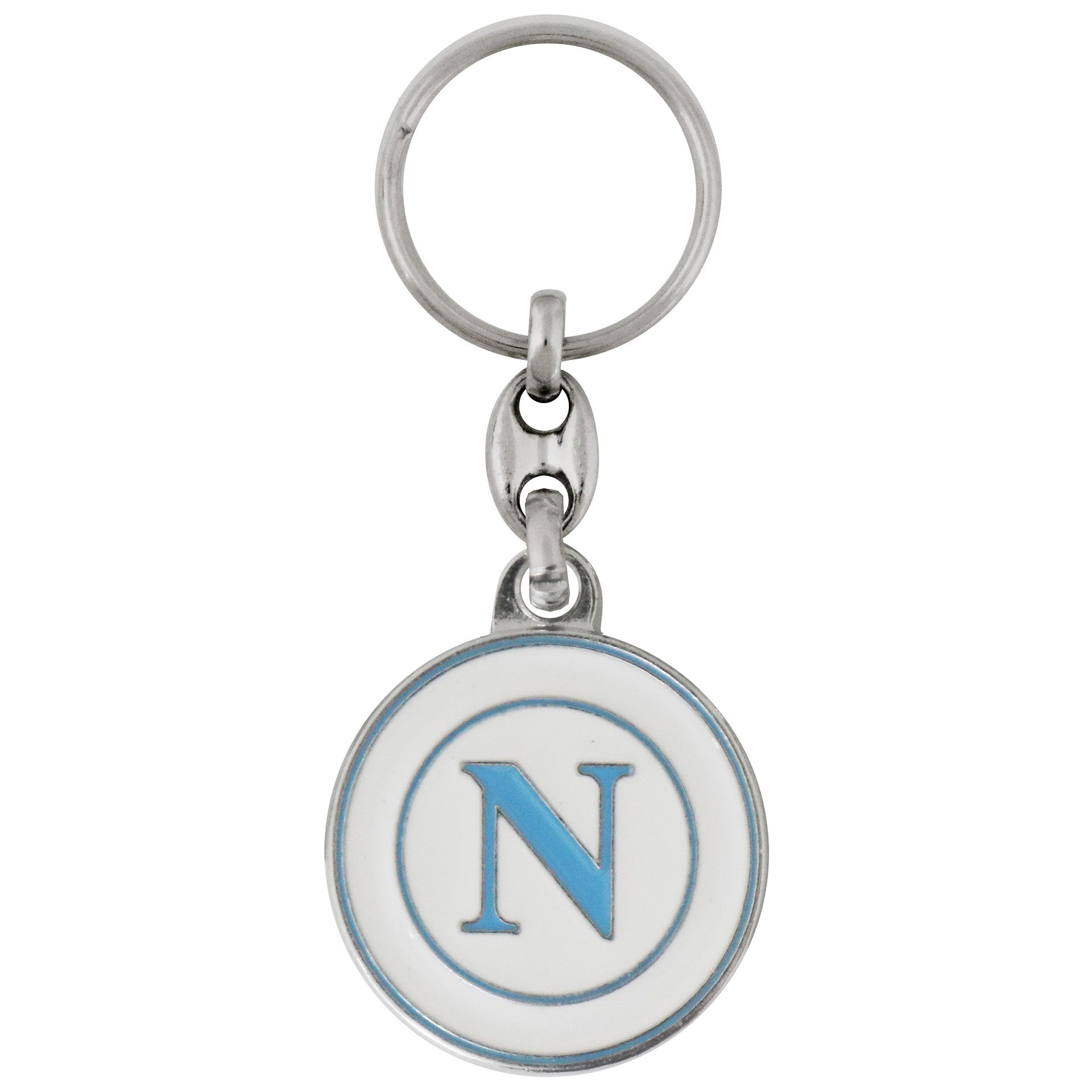 PORTACHIAVI IN METALLO SMALTATO CON LOGO CELESTE SU FONDO BIANCO