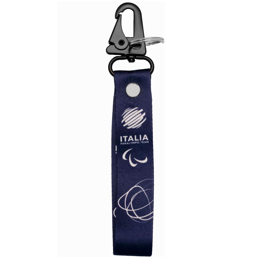 PORTACHIAVI ITALIATEAM IN STOFFA JACQUARD CON MOSCHETTONE LUNGHEZZA 13 CM LOGHI STAMPATI PARALYMPIC EMBLEMA E ITALIA PARALYMPIC TEAM BIANCHI SU FONDO BLU UGUALE FRONTE E RETRO