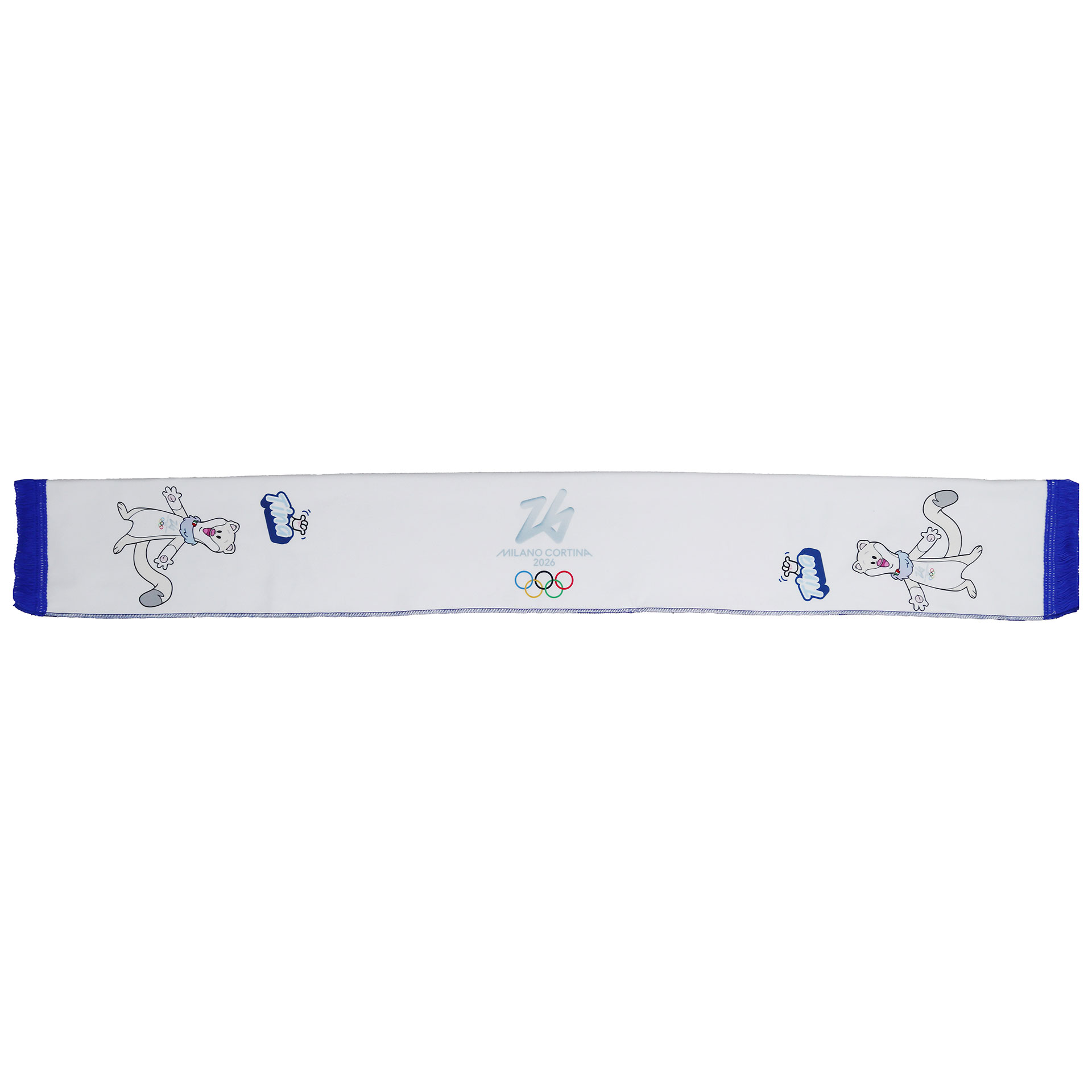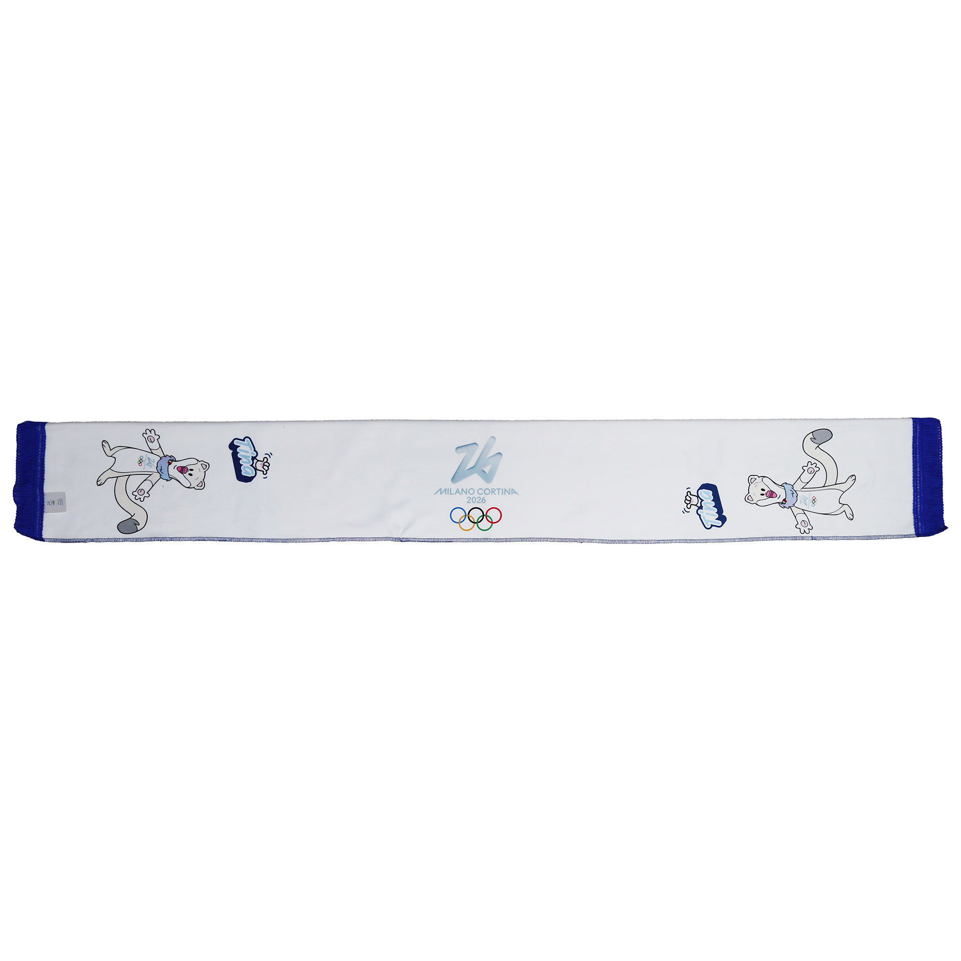 SCIARPA OLIMPIADI MILANO CORTINA 2026 IN POLIPILE STAMPATA DIM. 130X17CM FONDO BIANCO CON MASCOT TINA COLORATA