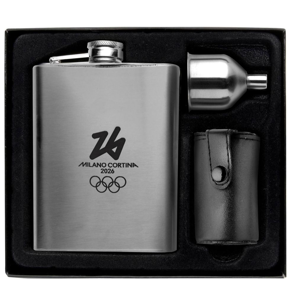 SET BORRACCETTA OLIMPIADI MILANO CORTINA 2026 IN ACCIAIO INOX 220 ML CON 4 BICCHIERI 30 ML ED IMBUTO LOGO OLYMPIC EMBLEMA 5 CERCHI STAMPATO A LASER