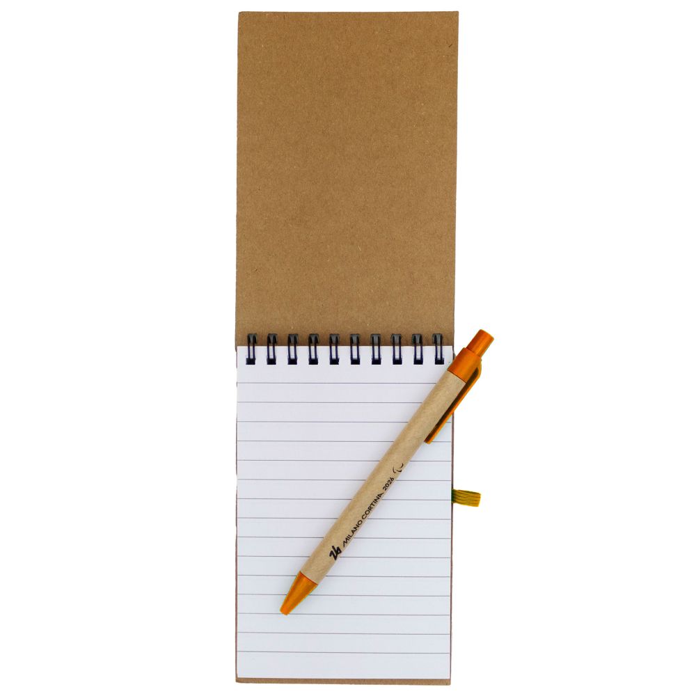 TACCUINO OLIMPIADI MILANO CORTINA 2026 IN CARTA RICICLATA, DIMENSIONI 10X14,5X0,08 CM, CHIUSURA AD ELSATICO, DETTAGLI ARANCIONI, CARTA RICICLATA E TELA, 70 PAG. A RIGHE, PENNA A SFERA CON CORPO IN CARTONE, REFILL BLU LOGHI PARALYMPIC EMBLEMA MONOCROMATICI NERO
