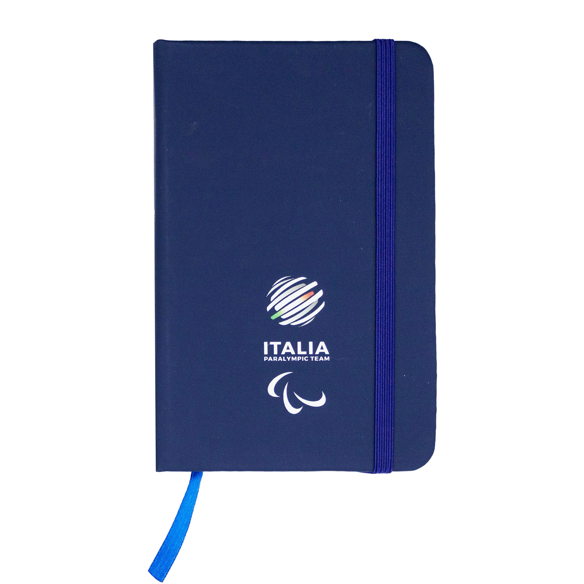 TACCUINO IN PU BLU,FORMATO A6, 96 PAGINE A RIGHE, ELSATICO E SEGNALIBRO IN TINTA, LOGHI PARALYMPIC EMBLEMA E ITALIA PARALYMPIC TEAM BIANCHI