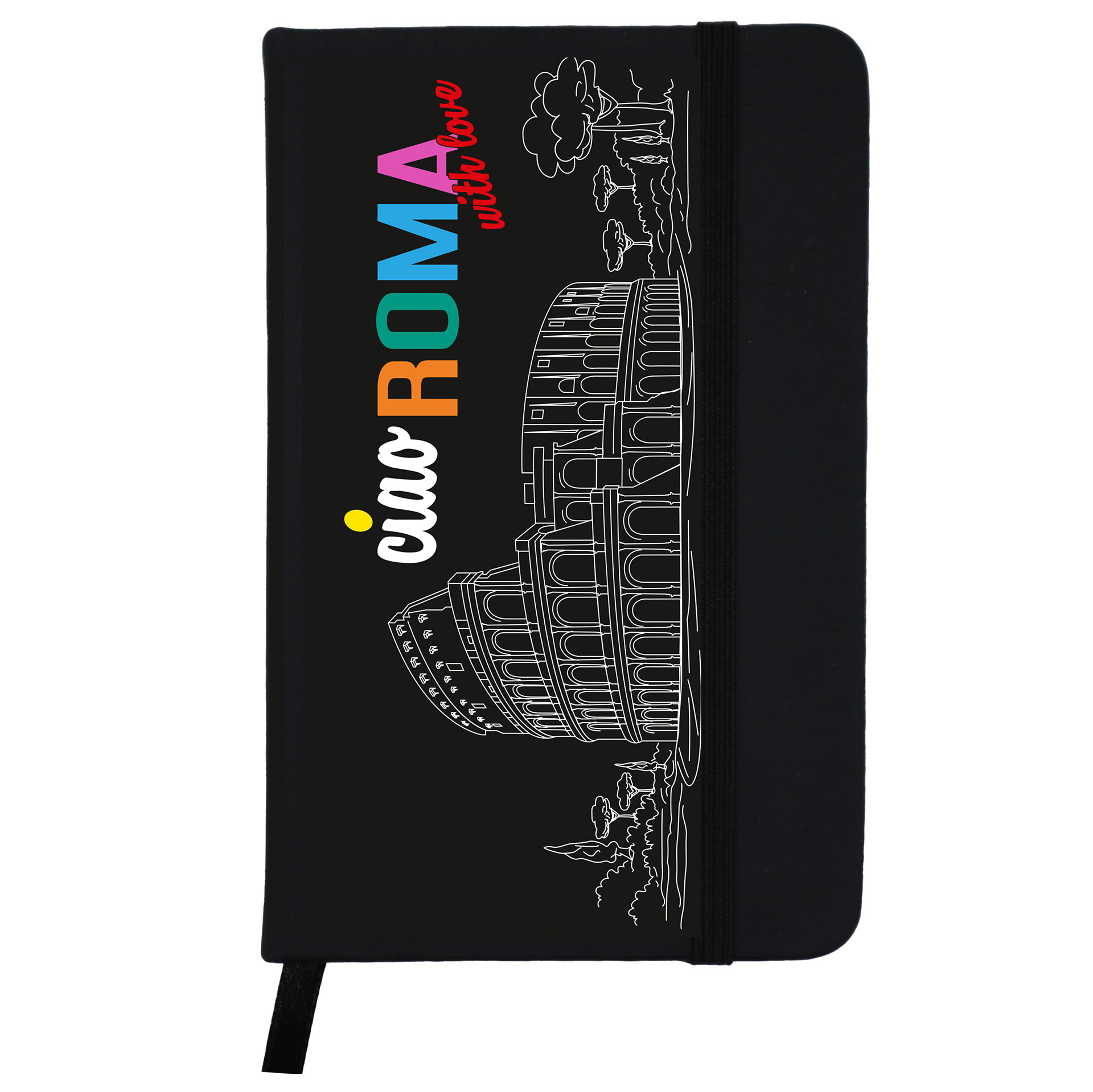 TACCUINO NERO A6 COPERTINA RIGIDA CON ELASTICO 14X9X1,5 CM ROMA WITH LOVE