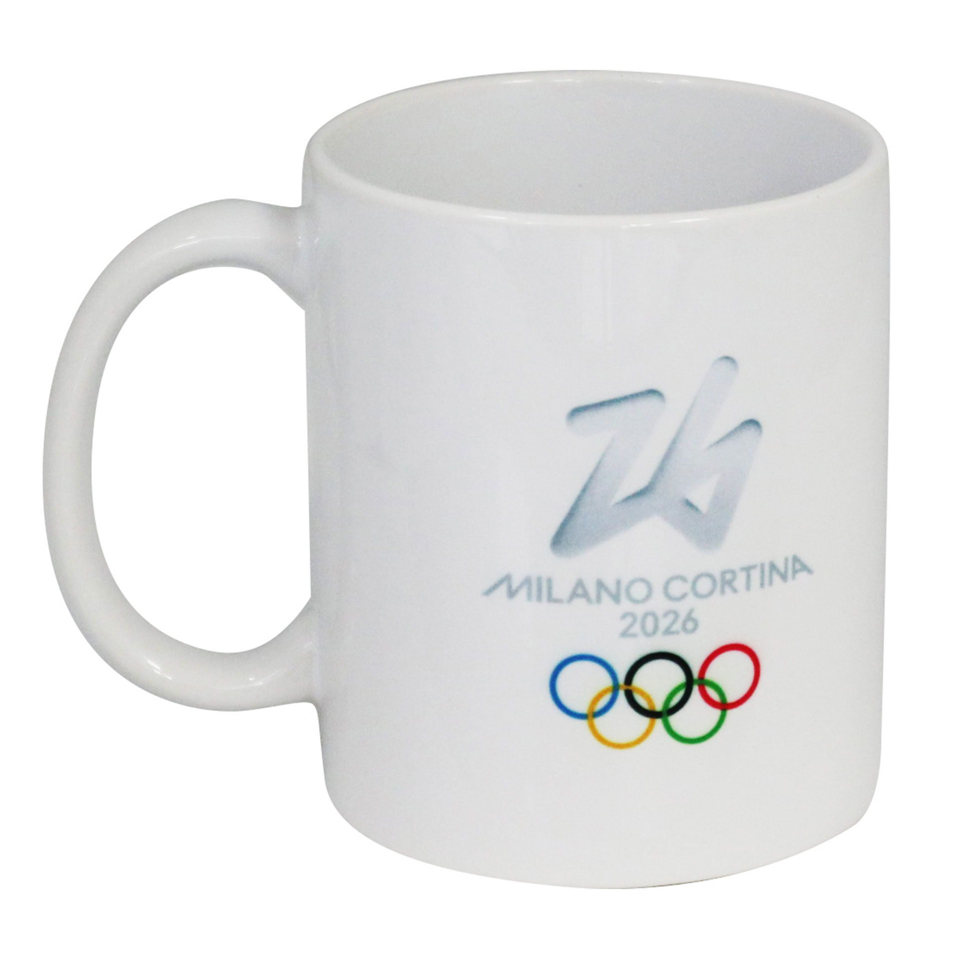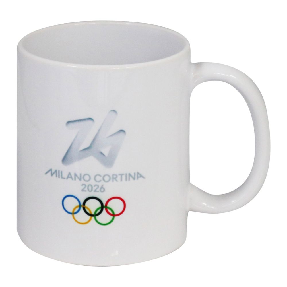 TAZZA MUG OLIMPIADI MILANO CORTINA 2026 IN CERAMICA DA COLLEZIONE DIMENSIONI DIAMETRO 8 CM LOGO OLYMPIC EMBLEMA COLORATO 5 CERCHI SU FONDO BIANCO