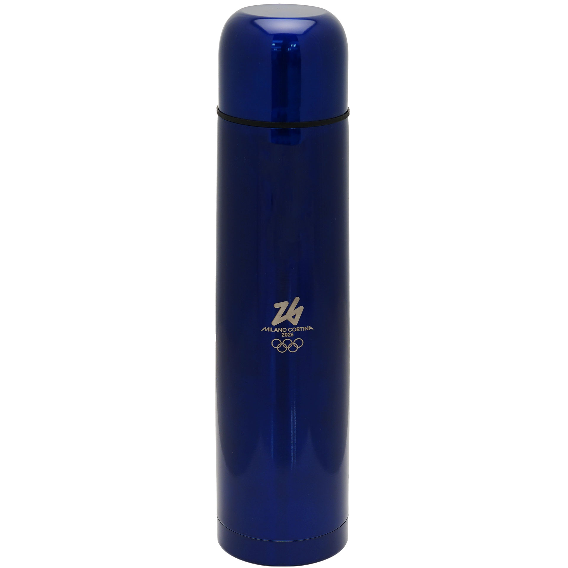 THERMOS OLIMPIADI MILANO CORTINA 2023 1000 ML IN ACCIAIO INOX DOPPIA PARETE DIAMETRO 8 CM LOGO OLYMPIC EMBLEMA MONOCROMATICO 5 CERCHI SU FONDO BLU MANTIENE APPROSSIVAMENTE IL LIQUIDO 24 ORE FREDDO E 12 ORE CALDO