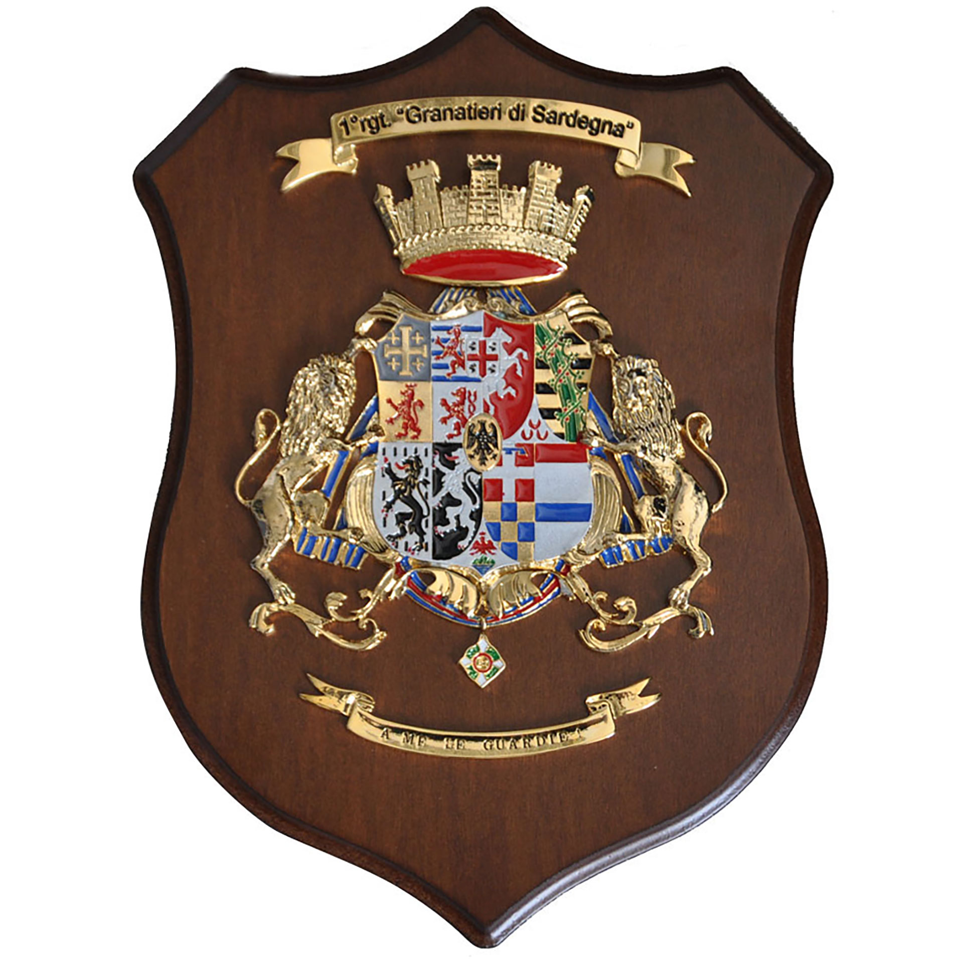 CREST IN METALLO SMALTATO BASE LEGNO 22,5X17,5CM 1 REGGIMENTO GRANATIERI DI SARDEGNA